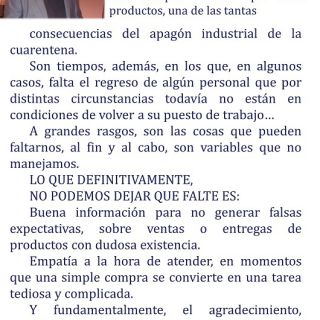 A pesar de todo lo que enfrentamos en nuestros comercios, crisis económica, cuarentena, crecimiento del comercio electrónico, ahí estamos nosotros, cumpliendo un poderoso mandato que nos otorga el soberano “el cliente”. El mismo que pese a toda restricción forma fila, inclusive con mucho frío, para entrar en nuestro comercio, diciendo de manera clara y contundente una vez más “los elijo”.