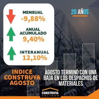 Índice Construya: agosto terminó con una baja en los despachos de materiales •Disminuyó un 9,88% mensual con respecto a julio • Tuvo una suba de 9,40% en el acumulado anual •Aumentó un 12,10% medido de manera interanual