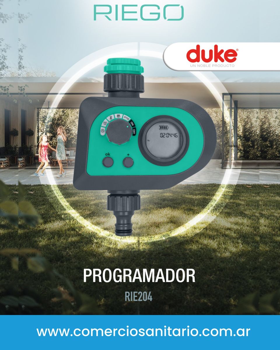 El Programador de Riego Digital de DUKE permite automatizar el cuidado del jardín de manera simple y precisa. Facilita la programación de la hora de inicio, duración y frecuencia del riego en pocos pasos, adaptándose a distintas necesidades y rutinas.