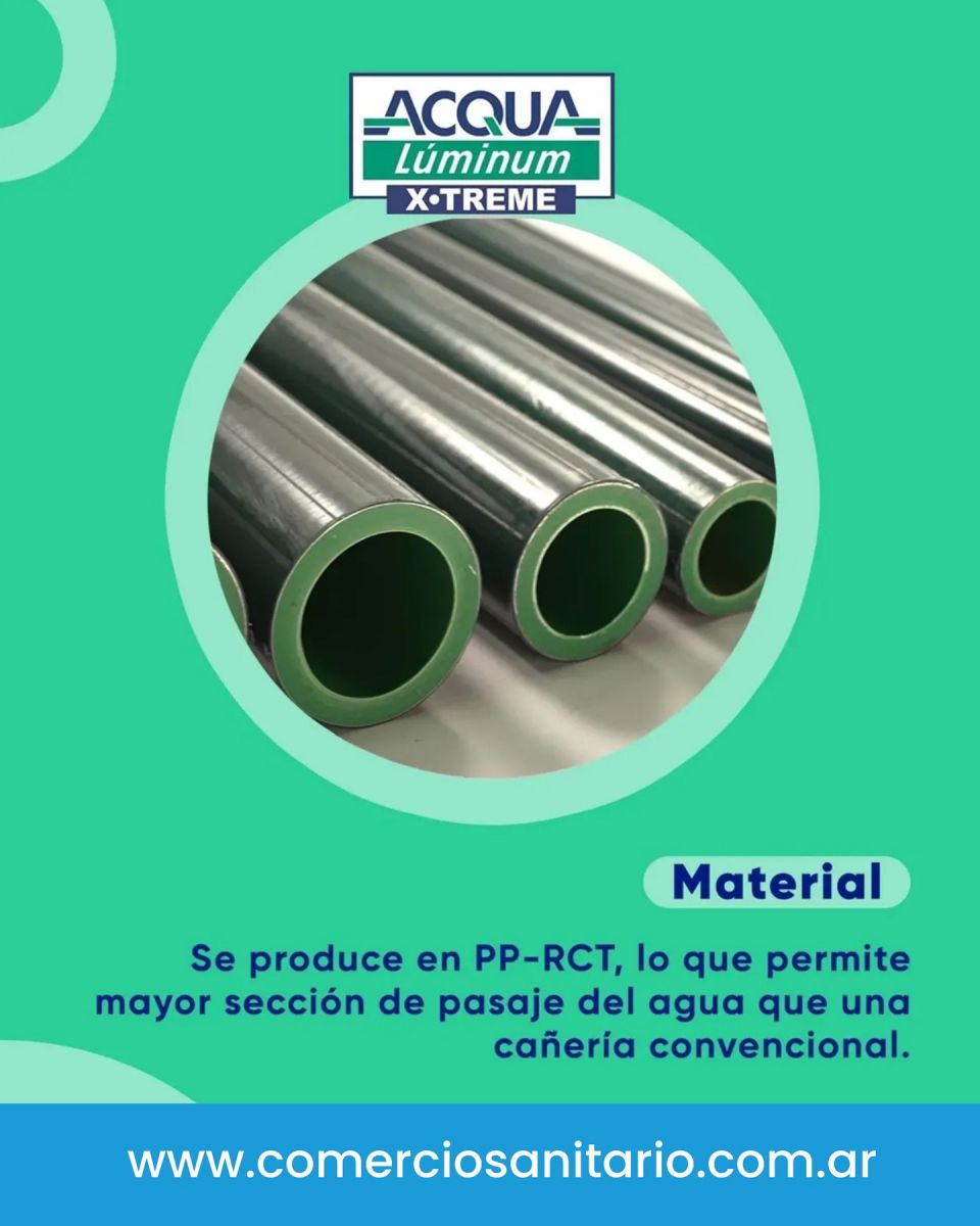 Fabricado en PPR CT de origen alemán, permite una mayor sección interior manteniendo la misma resistencia a la presión. Su capa de aluminio aporta rigidez, confiabilidad y lo vuelve ideal para instalaciones a la vista y calefacción por radiadores, con conexiones Acqua System PN 25.