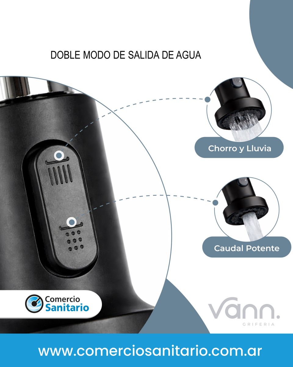 - Selector de salida de agua: chorro o rociador.