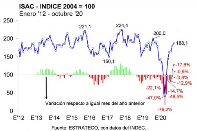 Informe EconómicoUn fin de año impensadoEn un contexto de marchas y contramarchas, en gran medida vinculadas a las restricciones de operación que generan los protocolos que buscan reducir los contagios por Covid-19, en los últimos meses de 2020 los despachos de los principales insumos para obras residenciales alcanzaron niveles impensados poco tiempo atrás. En Informes previos analizamos los factores que permiten explicar este fenómeno, en parte natural, luego de la estricta ‘cuarentena’ de marzo-abril, y en gran parte traccionado por los importantes desequilibrios macro que presenta la economía argentina, los que plantean oportunidades puntuales para ciertos sectores económicos, como es el caso de la construcción (no así para la actividad inmobiliaria). En tanto, la pregunta del millón sigue estando referida a la sostenibilidad del fenómeno hacia adelante.En octubre el Indicador Sintético de Actividad de la Construcción (ISAC) continuó recuperándose. La serie desestacionalizada se ubicó 4,3% por encima del nivel de septiembre y 9,0% por encima del nivel de febrero, último mes de actividad ‘normal’.Entre octubre de 2019 y octubre de 2020 el ISAC experimentó una caída de sólo 0,9%. Fue la más baja, desde que comenzó a caer en forma ininterrumpida en septiembre de 2018. Y la caída con relación al máximo histórico (diciembre de 2017) se redujo a 20,5%.En tanto, el Índice Construya (IC) desestacionalizado anticipó una corrección de 2,9% mensual para noviembre de 2020, si bien la recuperación con relación a febrero se mantuvo en 35,5%. La magnitud de la reactivación de la producción y los despachos del grupo Construya para obras residenciales permitieron que en noviembre se cumplieran ya seis meses consecutivos de variaciones interanuales positivas (+13,5% en noviembre 2020).Entre septiembre y octubre de 2020 nueve de los trece grupos de insumos que integran el ISAC registraron variaciones corregidas por estacionalidad positivas. En orden descendente, las subas correspondieron a: yeso (32,0%), mosaicos graníticos y calcáreos (23,4%), artículos sanitarios de cerámica (18,5%), pinturas para construcción (17,2%), asfalto (16,2%), ‘vidrio plano para construcción, tubos de acero sin costura y grifería’ (10,2%), hierro redondo y acero para construcción (7,7%), placas de yeso (6,8%) y hormigón elaborado (2,2%). Del otro lado de la línea se ubicaron las entregas de cales (-1,9%; 3º baja consecutiva), cemento Portland (-2,1%; 1º baja postreapertura), pisos y revestimientos cerámicos (-6,2%) y ladrillos huecos (-7,8%; 2º baja consecutiva, a pesar de lo cual continuaron siendo similares a los records observados en el último trimestre de 2017 y en la segunda mitad de 2015).Cuando se realiza la comparación de los despachos de insumos de octubre con los de febrero del corriente año, que fue el último mes de actividad ‘normal’, surge que once de los trece grupos de insumos incluidos en el ISAC exhibieron variaciones positivas. Tal como se puede observar en el gráfico precedente, las entregas de asfalto fueron las que más rebotaron (42,2%; no obstante, hay que tener presente que habían caído fuertemente en 2018 y 2019, en un marco de recesión y ajuste fiscal, quedando en un nivel mínimo en el primer trimestre de 2020), seguidas los despachos de placas de yeso (35,9%), pinturas para construcción (31,0%), artículos sanitarios de cerámica (30,4%), cales (25,7%), ladrillos huecos (23,0%), hierro redondo y acero para construcción (16,1%), cemento Portland (8,5%), mosaicos graníticos y calcáreos (6,6%), yeso (2,6%) y pisos y revestimientos cerámicos (0,7%). Sólo los envíos al canal comercial del agregado ‘vidrio plano para construcción, tubos de acero sin costura y grifería’ y los despachos de hormigón elaborado todavía no lograron recuperar el nivel de actividad pre ‘cuarentena’ (-26,4% y -32,0%, respectivamente).También el empleo formal en la construcción comenzó a mostrar en septiembre de 2020 una leve recuperación con relación al ‘piso’ que marcó la serie durante abril-agosto de 2020 (período en el cual el número de puestos de trabajo ocupados se ubicó en un promedio de 271.288). El total de puestos de trabajo llegó a 282 mil en septiembre, ubicándose 3,1% por encima de los registrados en agosto. Esto podría estar indicando que la reactivación observada inicialmente a nivel de obras de refacción, ampliación y construcciones chicas, se estaría extendiendo a obras medianas/grandes (privadas y ¿públicas?).Finalmente, cuando se mira hacia adelante, en septiembre la superficie autorizada para construir en el conjunto de 60 municipios relevados habitualmente por el INDEC, equivalió a 430,1 mil metros cuadrados. Si bien el área fue inferior a la registrada en agosto, se mantuvo por encima de los niveles de junio y julio. No obstante lo cual, en la comparación interanual continuó resultando inferior (-31,1% en esta ocasión; -193,8 mil metros cuadrados).Con estos guarismos, en los primeros nueve meses de 2020 la superficie autorizada para ejecutar obras privadas sumó un total de 3,8 millones de metros cuadrados en los 60 municipios considerados y resultó 41,4% menor a la aprobada en enero-septiembre de 2019 (-2,68 millones de metros cuadrados).Fuente: Índice ConstruyaLic. Pablo A. LaraDirector de ESTRATECO Consultores