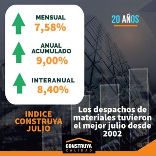 El Índice Construya (IC), que elabora el Grupo Construya desde junio del 2002 registró una suba mensual desestacionalizada de 7,58% con respecto al mes anterior, manteniendo un alto y estable nivel de actividad con respecto a años anteriores, para el conjunto de empresas que conforman Construya. A su vez registró una suba de 8,40% con respecto a julio del año pasado y arroja un crecimiento del 9 % acumulado respecto del mismo periodo de 2021.