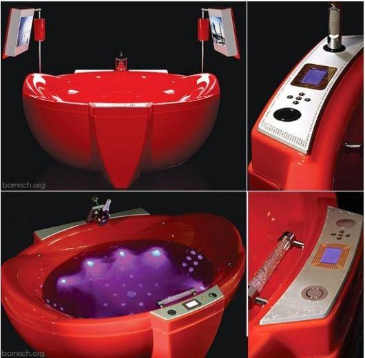 7. Red Diamond de WaterGamesTechnologies es un concepto impecable que ha apuntado a quienes gustan bañarse en un recinto de lujo. Pensada por el diseñador Aldo Puglielli su silueta es ovalada y muy moderna aunque lo más llamativo es la inclusión de una pequeña consola con un marco de oro (de 42 gramos y 18 kilates) y cristales de Swarovski. Por un lado cuenta con dos televisores a prueba de agua que desaparecen cuando no están en uso y el artefacto cuenta además con un módulo GSM que permite el control de la bañera a la distancia.