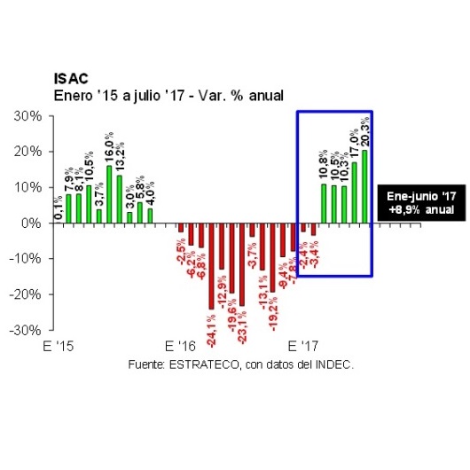 Julio mostró buen ritmo de recuperación y mejores perspectivas para las obras privadas En julio el Indicador Sintético de Actividad de la Construcción (ISAC) se ubicó 20,3% por encima del nivel alcanzado en julio del año pasado, lo que elevó a 8,9% anual la recuperación acumulada en los primeros siete meses del año.En primer lugar, en lo que va del año se observa una muy significativa recuperación de la inversión pública en construcción, lo cual se refleja en la velocidad a la que se expanden las entregas de los insumos vinculados a las obras viales y de infraestructura y también el empleo formal de la construcción. En segundo lugar, la inversión privada (el componente más importante de la inversión total en construcción) y el gasto en mejoras/refacciones están comenzando a mostrar signos también positivos, pero mucho más moderados que en el caso de las obras públicas. En tercer lugar, las elevadas variaciones interanuales también están explicadas por la baja base de comparación que establecieron los despachos de insumos verificados un año atrás.En julio de 2017 todos los insumos que conforman el ISAC registraron mayores despachos que en julio de 2016 y en el acumulado de los primeros siete meses del año sólo las entregas de sanitarios de cerámica quedaron por debajo del nivel registrado en enero-julio del año pasado.La puesta en marcha de las obras públicas, luego de la parálisis observada entre el último trimestre de 2015 y el tercer trimestre de 2016, continuó ejerciendo fuerte tracción sobre los despachos de asfalto, hierro redondo para hormigón y cemento Portland a granel. Tal como surge del gráfico que se presenta a continuación, en julio del corriente año estos tres insumos fueron los más dinámicos, con subas interanuales de 95,1%, 45,5% y 45,3%, respectivamente. Y en esta oportunidad se sumaron también las entregas de sanitarios de cerámica, que resultaron 30,2% mayores a los de julio de 2016, si bien en el acumulado del año todavía resultaron inferiores a los verificados en enero-julio de 2016.En lo que respecta a los despachos de cemento Portland a granel, en julio ascendieron a 425.603 toneladas, elevando el total a 2,566 millones de toneladas en el acumulado del año (25,9% anual). Puesto en términos absolutos, en los primeros siete meses del año se entregaron 527,6 mil toneladas de cemento a granel más que en igual período del año anterior, lo que explicó 82,1% del crecimiento total de los despachos de cemento Portland. Y 82,9% del rebote se explicó por los mayores consumos en cinco jurisdicciones: GBA (30,4% del crecimiento interanual), resto de la provincia de Buenos Aires (20,5%), Córdoba (11,9%), Santa Fe (10,9%) y Tucumán (9,2%; provincia que registró la mayor recuperación relativa: 99,9% interanual).En los primeros siete meses del año, las entregas de asfalto y de hierro redondo para hormigón también exhibieron elevadas tasas de recuperación. En el primer caso, la variación llegó a 89,7% anual. En el segundo caso, fue de 24,9% anual.Una segunda tanda quedó integrada por los envíos al mercado de tubos sin costura (que en términos estadísticos aparecen combinados con los de vidrios para construcción), los ladrillos huecos, las placas de yeso y las pinturas para construcción. En estos cuatro casos, entre julio de 2016 y julio de 2017 las entregas resultaron entre 10% y 20% superiores, tal como surge del gráfico precedente.El ránking correspondiente a las variaciones julio ’16-julio ’17 se completó con los despachos de cemento Portland en bolsa y de pisos y revestimientos cerámicos. Los despachos de cemento en bolsa equivalieron a 591 mil toneladas en julio de 2017 (6,3% anual) y a 3,970 millones de toneladas en los primeros siete meses del año (3,0%). Estos representaron 60,7% del total de los despachos registrados en el corriente año, pero contribuyeron sólo con 17,9% a la recuperación total. Cabe señalar que en este caso, cinco jurisdicciones explicaron 62,3% de la suba interanual observada, lo que arrojó una menor concentración que en el caso de las entregas a granel señalada más arriba. En los envíos en bolsa, Santa Fe fue la que más aportó al crecimiento del volumen entregado, con 17,7%, seguida por resto de la provincia de Buenos Aires (12,2%), Tucumán (12,1%), GBA (10,6%) y Chaco (9,7%). Por su parte, los envíos de pisos y revestimientos cerámicos resultaron apenas 1,7% mayores a los de julio de 2016.Al considerar los primeros siete meses del año, la segunda tanda de insumos más dinámicos pasó a estar integrada por pinturas para construcción, placas de yeso, tubos sin costura/vidrio y cemento Portland bolsa. Los primeros dos lograron ubicarse poco más de 8,0% por encima del año previo, en tanto que los de tubos mostraron un avance de 4,6% anual y las entregas de cemento Portland en bolsa un rebote de 3,0% interanual. En cambio, los ladrillos huecos lograron mantener el volumen entregado en enero-julio de 2016 (0,3% anual), aún a pesar de la recuperación que comenzaron a exhibir en los últimos cuatro meses.El nivel de ocupación formal en la actividad de la construcción también continuó recuperándose en junio del corriente año. De acuerdo con las estadísticas del IERIC, la cantidad de puestos de trabajo formales en el sector ascendió a 408.503 en el sexto mes del año, lo cual implicó una mejora de 11,9% con relación al ‘piso’ registrado en julio del año pasado (+43.427). En tanto, al contrastar con el ‘máximo’ alcanzado en septiembre de 2015, la ocupación formal todavía exhibió una baja de 4,6% (-19.580).Al contrastar junio de 2017 con junio de 2016, se registraron mejoras en 20 jurisdicciones del país (la provincia de Buenos Aires se presenta dividida en GBA y resto de la provincia, y además el IERIC agrega una línea para los que quedan transitoriamente ‘sin asignar’). El conjunto de estas 20 jurisdicciones registró 376.691 puestos 