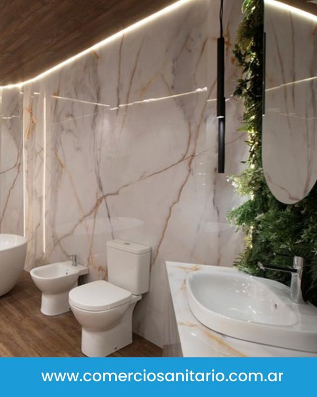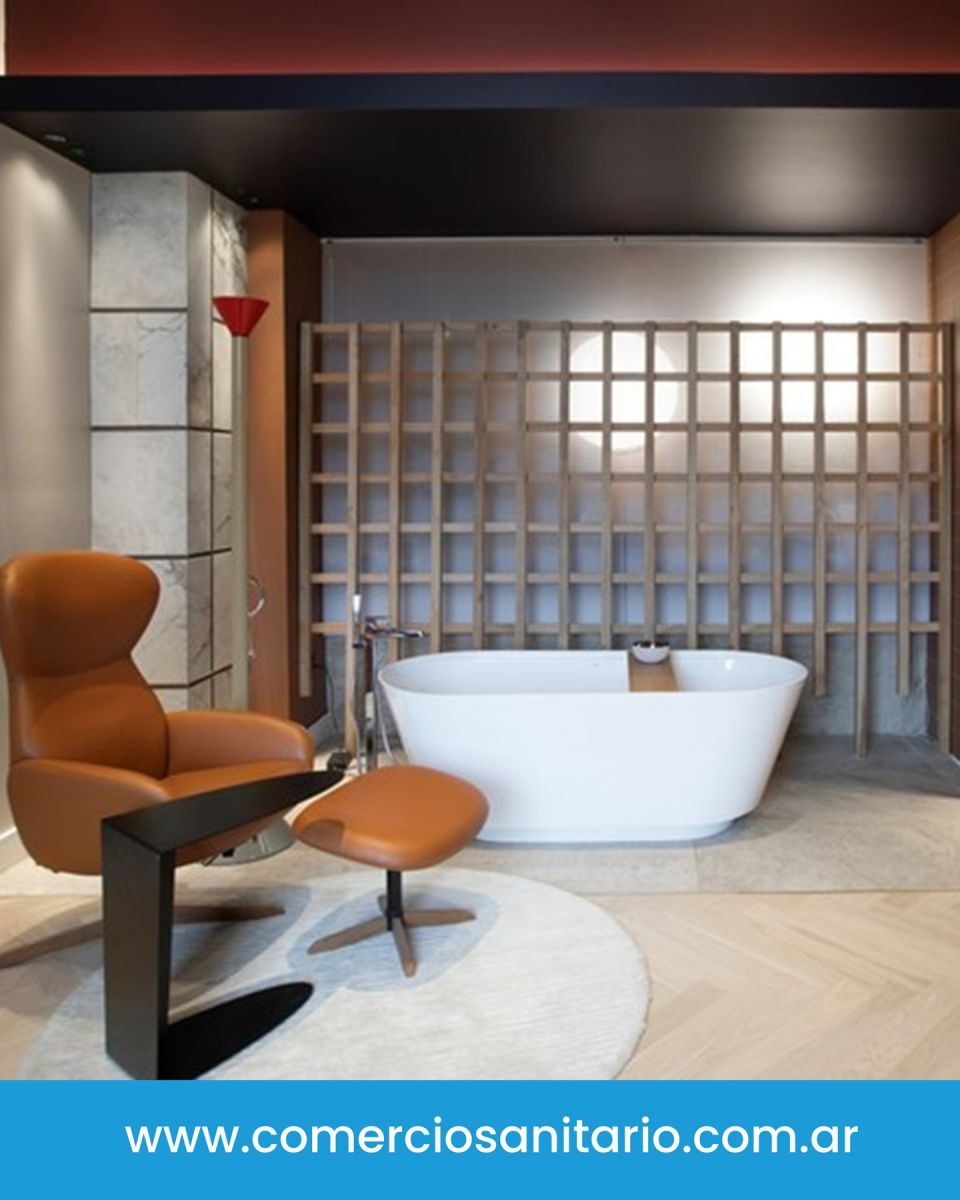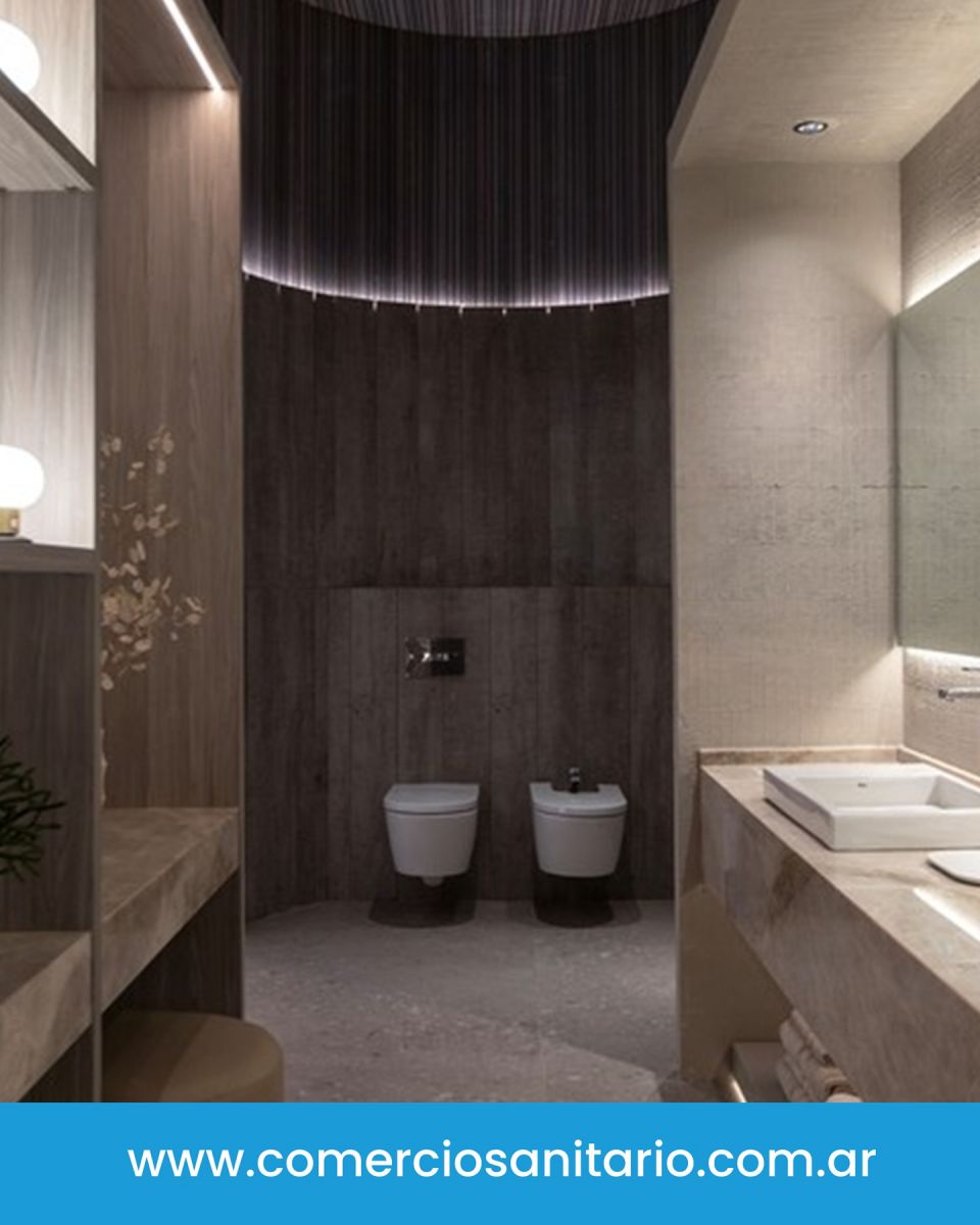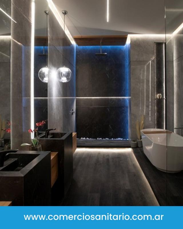 Por último, aparecen diseños versátiles y funcionales, integrados a espacios de uso social, con bachas negras, bañeras transparentes y una iluminación pensada para priorizar la privacidad y el confort.