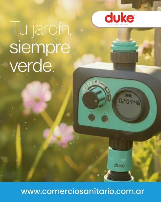 El Programador de Riego Digital de DUKE permite automatizar el cuidado del jardín de manera simple y precisa. Facilita la programación de la hora de inicio, duración y frecuencia del riego en pocos pasos, adaptándose a distintas necesidades y rutinas.